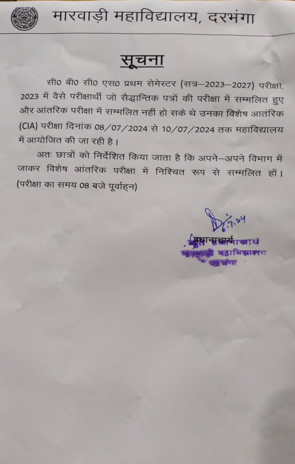 NOTICE REGARDING UG 1ST SEMESTER CIA EXAM (2023-27)