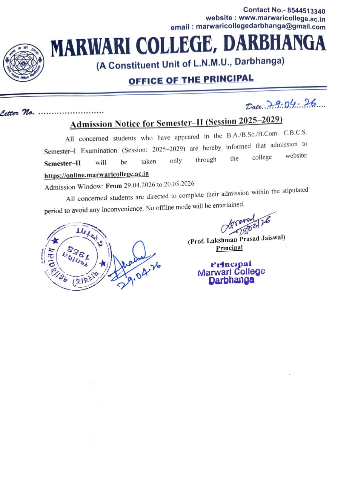 ADMISSION NOTICE FOR SEMESTER -II (2025-29)