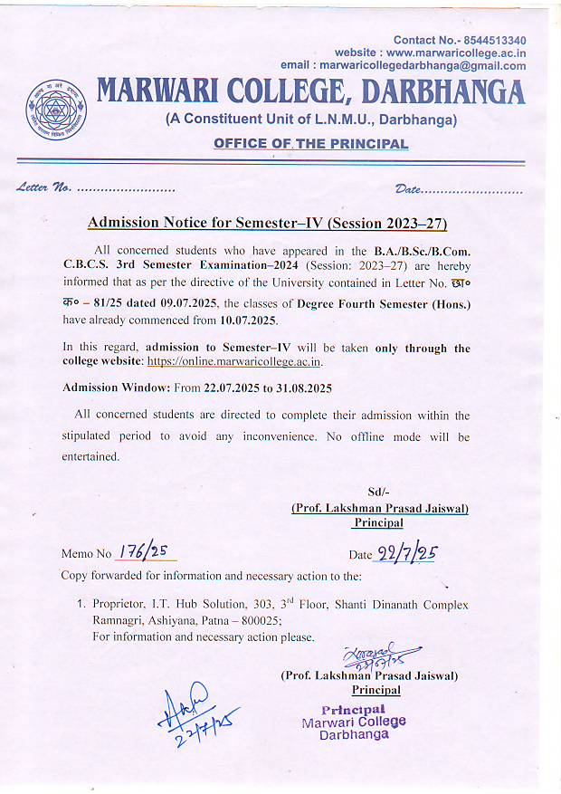 NOTICE REGARDING UG 4TH SEMESTER ADMISSION (2023-27)