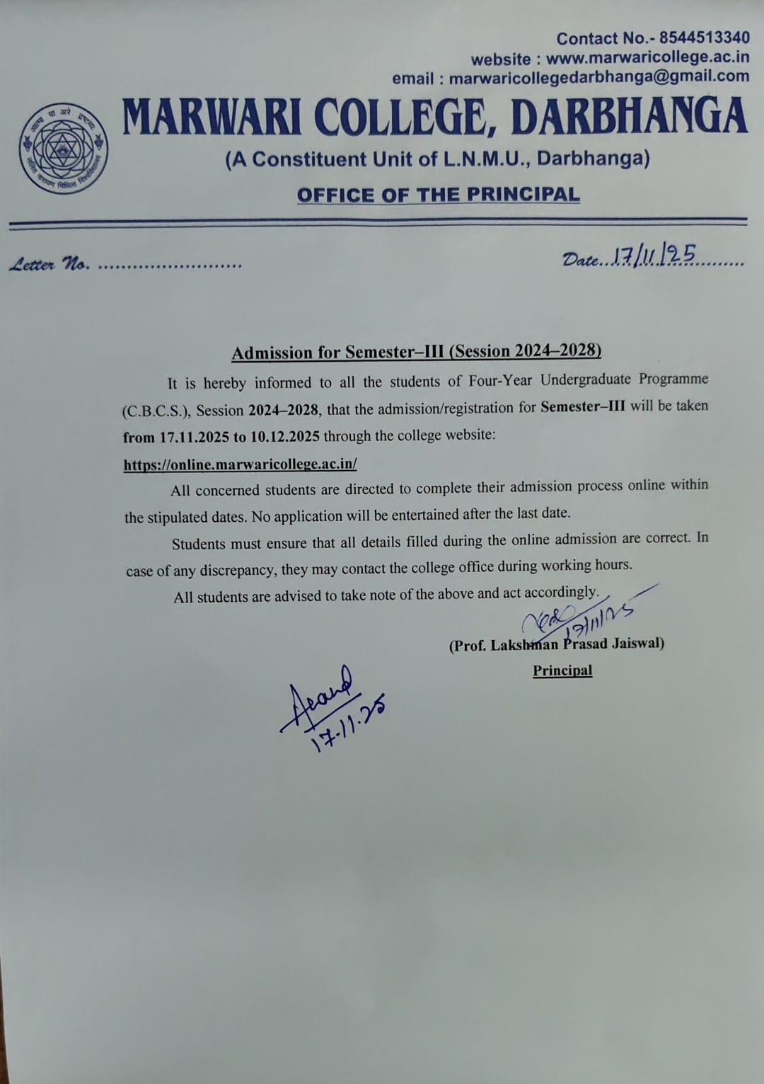 NOTICE REGARDING UG 3RD SEMESTER ADMISSION (2024-28)